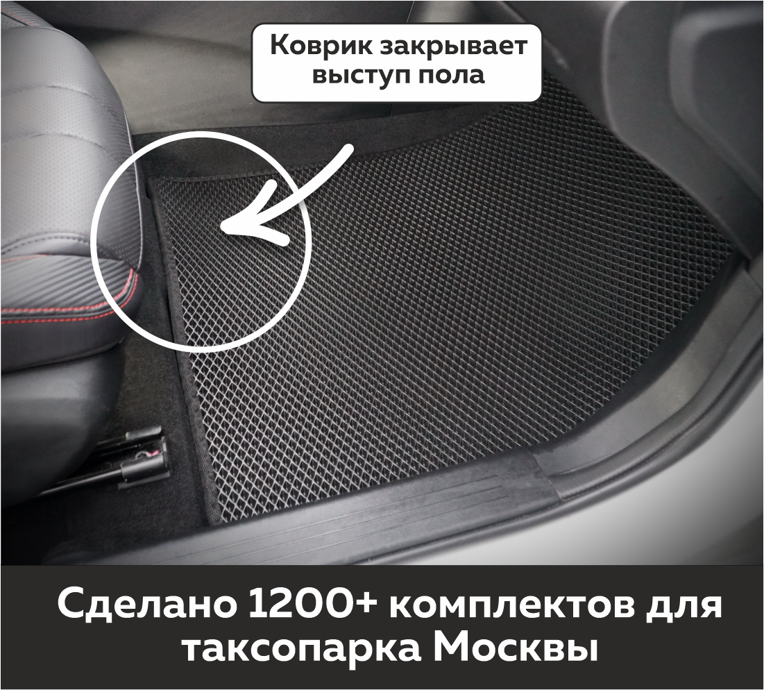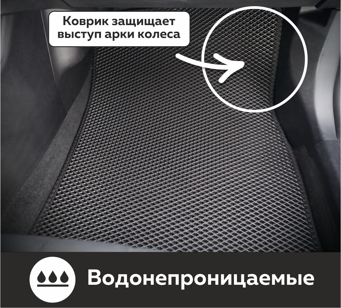 Толщина ковриков EVA составляет 10-12 мм. Глубина ячеек 7-8 мм. Такая толщина ковриков позволяет им служить довольно долго, не протираясь до 3 лет. А благодаря такой глубине ячеек коврик EVA площадью 1 кв.м. способен захватить около 3,5 л жидкости, сохраняя в чистоте вашу обувь и обивку салона.