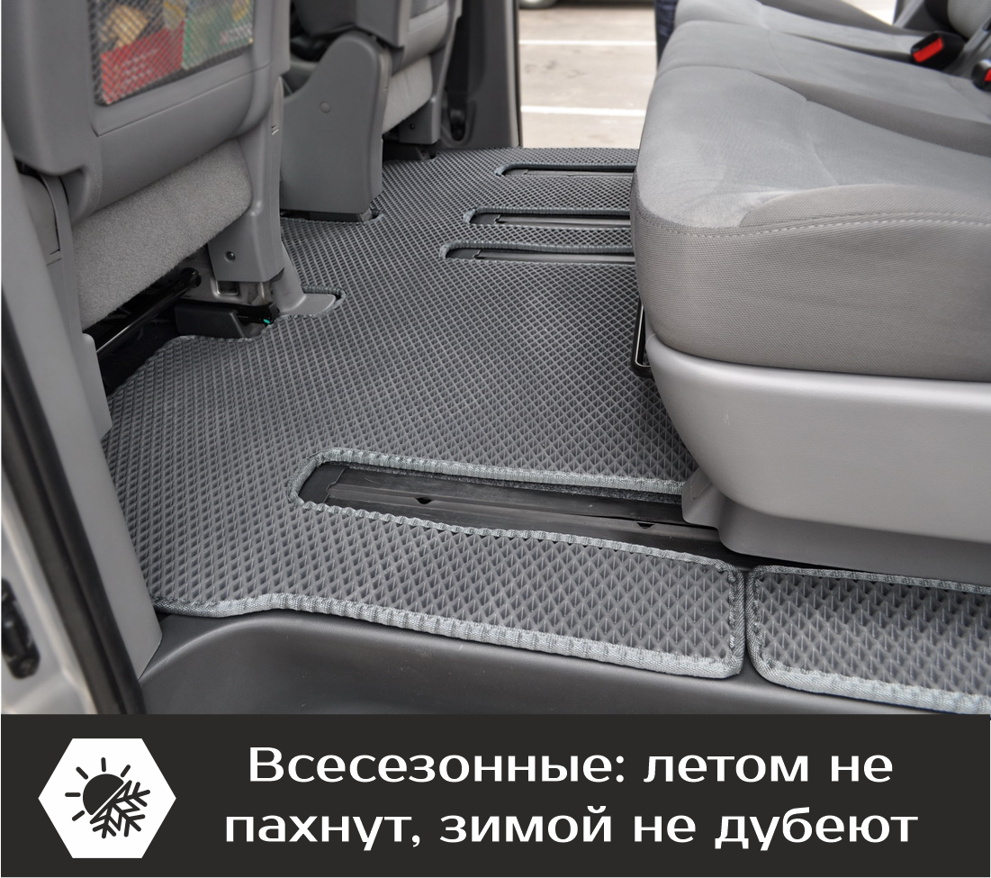 Коврики EVA всесезонные. Их можно использовать зимой, так как они не трескаются на морозе и остаются пластичными до -50 °С. А также летом, так как они не выделяют запаха на жаре до +50 °С. Зимой коврики спокойно выдерживают контакт с дорожными реагентами. Материал абсолютно непромокаемый. Ячеистая структура коврика эффективно собирает снег, грязь, песок, пыль круглый год.